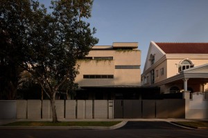 Bố cục công năng được tổ chức theo kiểu truyền thống nhưng hợp lý: tầng trệt dành cho sinh hoạt chung và ăn uống; các tầng trên là không gian riêng như phòng ngủ và phòng làm việc. Ở cao độ lớn hơn, mặt đứng được khoét các ô cửa dài và hẹp để vừa đảm bảo riêng tư, vừa giảm bức xạ trực tiếp – cách ứng xử quen thuộc với khí hậu nóng ẩm Singapore.